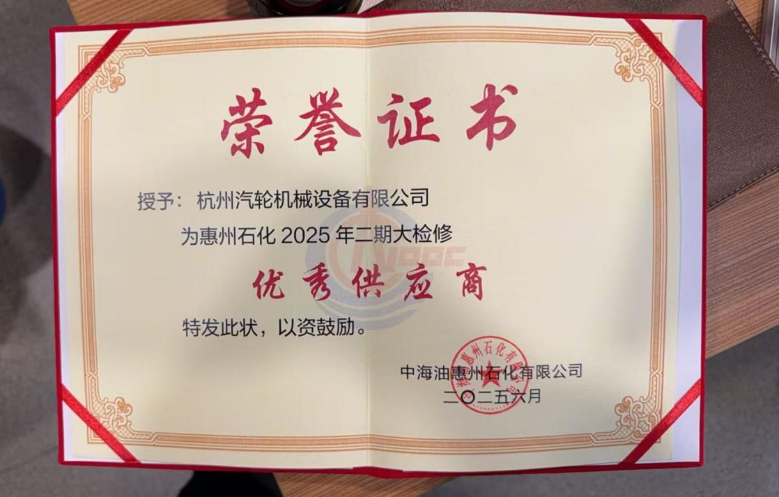 今年上半年,我司承接了中海油惠州石化二期装置共8台汽轮机组的大修技术服务工作。在此期间,我司技术团队应客户要求,针对关键汽轮机设备开展了专项检修指导,凭借扎实的专业技术和优质的服务,有力保障了设备的稳定运行,最终获评“优秀供应商”。